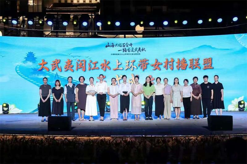 活动现场,多项重磅环节为巾帼赋能与区域协同注入新活力。全国美丽庭院女主人沈枝丹(“乡愁”沈丹)获授牌,其扎根乡土的实践让“她力量”成为乡村振兴的鲜明注脚;“山海风物推介官”代表分享闯市场、拓销路的经历,展现闽山闽水间文化与物产“出山入海”的蓬勃态势。此外,“大武夷闽江水上环带女村播联盟”正式成立,各县市女村播代表共同摸屏点亮启动装置,标志着环带内特产产销对接迈入“抱团发展”新阶段;福建百合花卉产业集团揭牌、延平影视产业代表对话交流、百合花产业链妇联与影视产业链妇联同步揭牌,一系列举措推动延平特色产业与巾帼力量深度融合。最后,与会领导共同注入象征闽江源头的“活水”启动活动,水雾中浮现活动主题的瞬间,恰似闽江沿线各县市的“共富梦想”一同点亮。